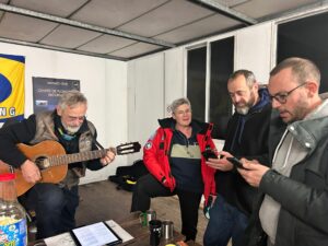 Samedi nous avons eu le droit à un temps plus que maussade avec beaucoup de pluie, dense et autres, avec peu d’éclaircis. Le dimanche le ciel s’est rattrapé, pas de pluie. Heureusement la température de l’eau a été le plus 14° de 0 à 40m. Et Jacques guitariste amateur émérite a animé la soirée du samedi soir.